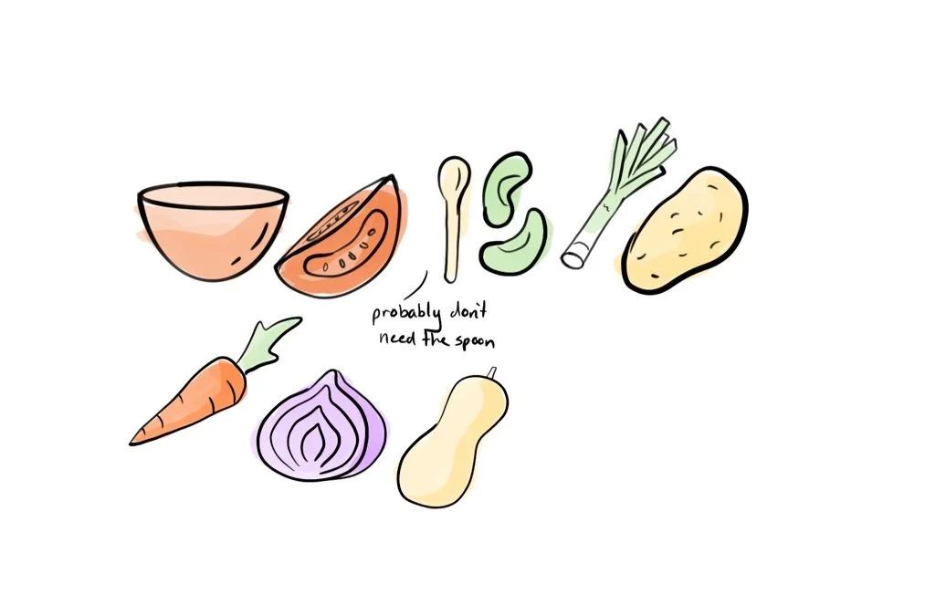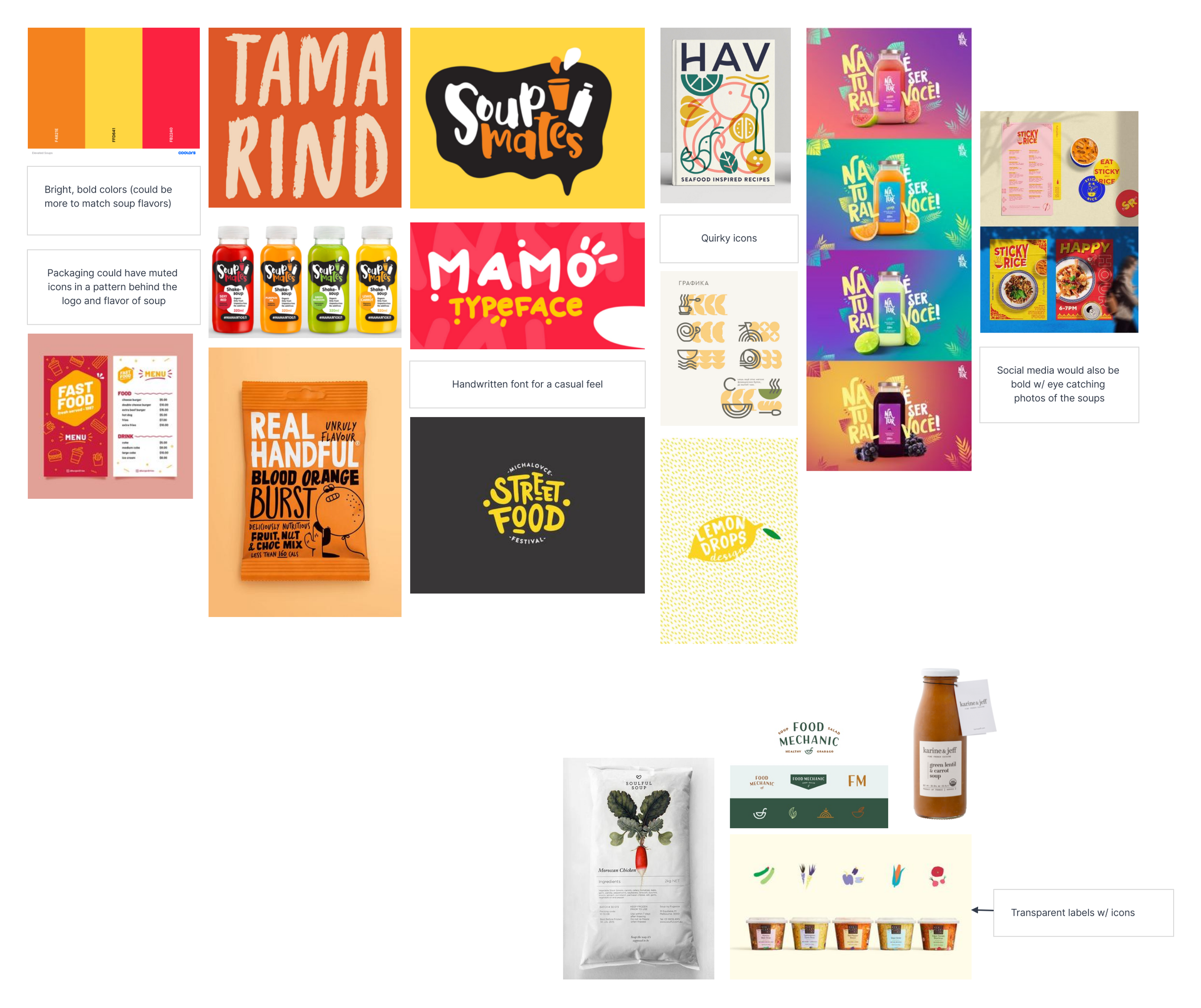 In the concept phase, I presented a moodboard with ideas of hand-drawn elements and a quirky font for soup flavors. The bright colors and minimal design allowed customers to quickly read the soup flavor and recognize them from afar. The food elements contributed to the approachable and lighthearted personality of the brand.
