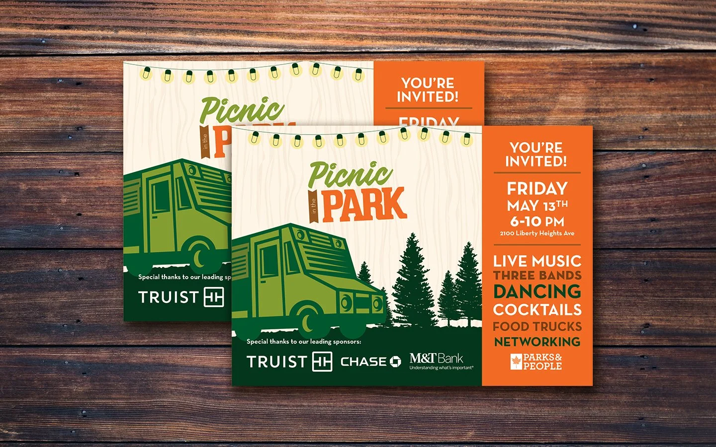 The Parks & People Foundation hosts an annual Picnic in the Park event to raise money to maintain Baltimore’s green spaces. I was asked to create their promo items to showcase their food trucks and live entertainment.